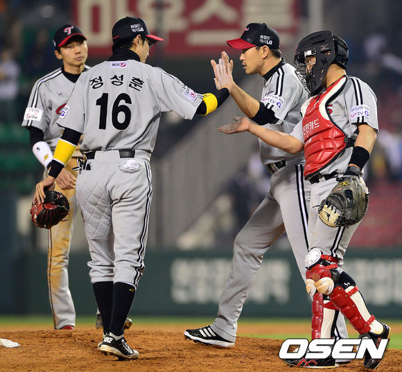 경기 종료 후 LG 선수들이 승리의 기쁨을 나누고 있다. /sunday@osen.co.kr