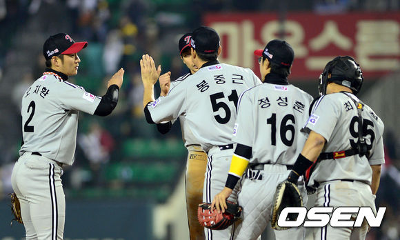 경기 종료 후 LG 선수들이 승리의 기쁨을 나누고 있다. /sunday@osen.co.kr