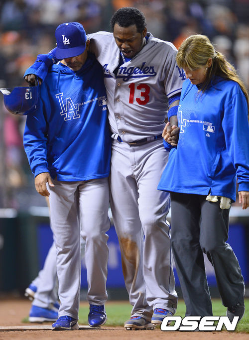 6회초 다저스 공격 무사 1루 상황 5번 A.J 엘리스의 우익수 앞 안타 때 1루 주자 핸리 라미레스가 3루까지 내달리다 자이언츠 3루수 파블로 산도발의 태그에 걸려 아웃됐다. 이후 다리를 절뚝이며 고통을 호소한 라미레스가 부측을 받으며 더그아웃으로 들어오고 있다./ youngrae@osen.co.kr