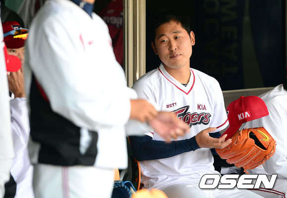 4일 오후 서울 목동야구장에서 열린 2013 한국야쿠르트 세븐프로야구 넥센 히어로즈와 KIA 타이거즈의 경기, 경기에 앞서 KIA 윤석민이 덕아웃에서 동료들과 이야기를 나누고 있다.