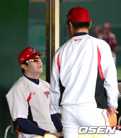 4일 오후 서울 목동야구장에서 열린 2013 한국야쿠르트 세븐프로야구 넥센 히어로즈와 KIA 타이거즈의 경기, 경기에 앞서 KIA 양현종이 덕아웃에서 동료와 이야기를 나누고 있다.