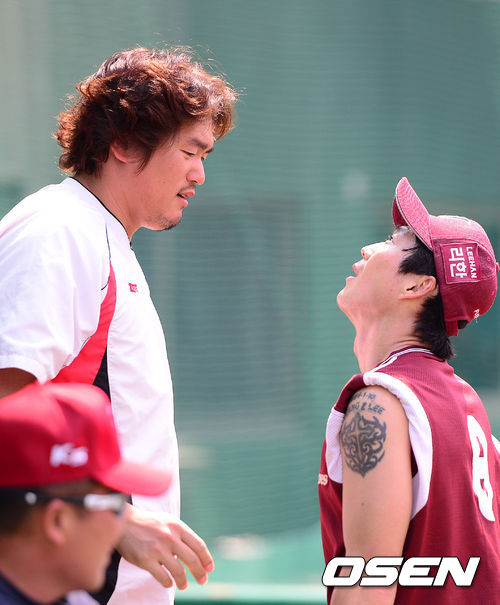 4일 오후 서울 목동야구장에서 열린 2013 한국야쿠르트 세븐프로야구 넥센 히어로즈와 KIA 타이거즈의 경기, 경기에 앞서 KIA 최희섭과 넥센 정수성이 인사를 나누고 있다.