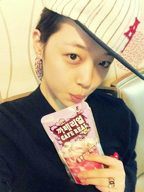 사진 속에 설리는 화장기가 전혀 없는 민낯으로 우윳빛 같은 피부를 뽐내고 있다. 특히 설리는 단발머리를 하나로 묶고 큰 모자를 쓰고 있어 남장을 한 듯 힙합보이 느낌이 물씬 풍긴다.