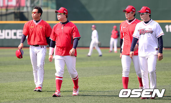 4일 오후 서울 목동야구장에서 열린 2013 한국야쿠르트 세븐프로야구 넥센 히어로즈와 KIA 타이거즈의 경기, 경기에 앞서 KIA 선수들이 훈련을 마치고 덕아웃으로 가고 있다.