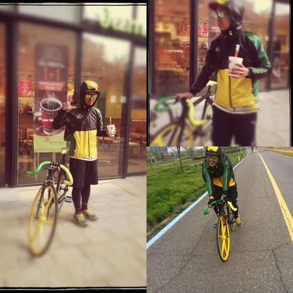 사진 속 하하는 재킷과 운동화, 자전거까지 자메이카 국기의 색상인 노란색, 초록색, 검은색으로 맞춰 남다른 레게 사랑을 뽐내고 있다.