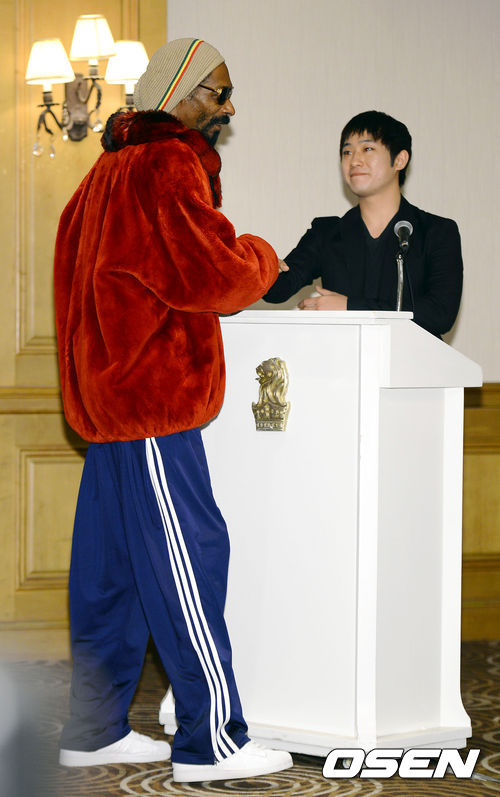 4일 오후 서울 리츠칼튼호텔에서 진행된 미국 힙합가수 스눕독(Snoop Dogg) 첫 내한 공연 '유나이트 올 오리지날스 스눕독 라이브 인 서울(Unite all originals Snoop Dogg live in seoul)' 기자회견에서 스눕독이 진행자와 악수를 나누고 있다.