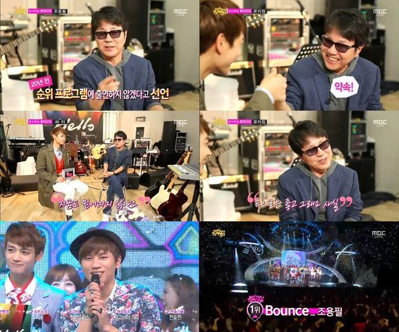 조용필은 4일 오후 방송된 MBC '쇼!음악중심'에서 신곡 '바운스'로 싸이의 '젠틀맨'을 누르고 1위를 거머쥐었다.