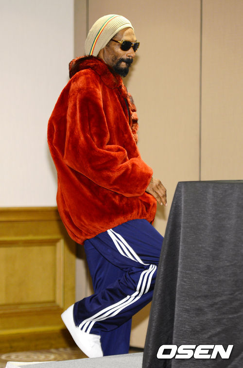 4일 오후 서울 리츠칼튼호텔에서 진행된 미국 힙합가수 스눕독(Snoop Dogg) 첫 내한 공연 '유나이트 올 오리지날스 스눕독 라이브 인 서울(Unite all originals Snoop Dogg live in seoul)' 기자회견에서 스눕독이 무대로 입장하고 있다.