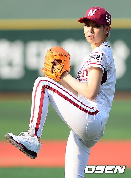 4일 오후 서울 목동야구장에서 열린 2013 한국야쿠르트 세븐프로야구 넥센 히어로즈와 KIA 타이거즈의 경기, 경기에 앞서 걸그룹 GI 아람이 시구를 하고 있다.