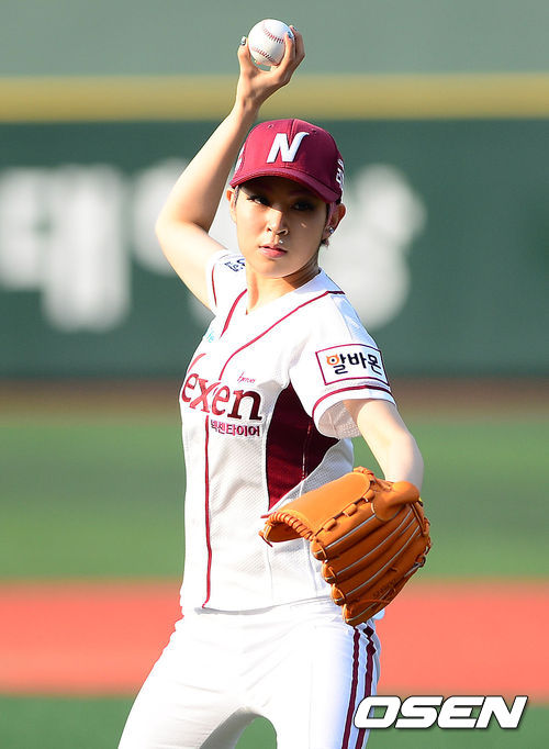 4일 오후 서울 목동야구장에서 열린 2013 한국야쿠르트 세븐프로야구 넥센 히어로즈와 KIA 타이거즈의 경기, 경기에 앞서 걸그룹 GI 아람이 시구를 하고 있다.