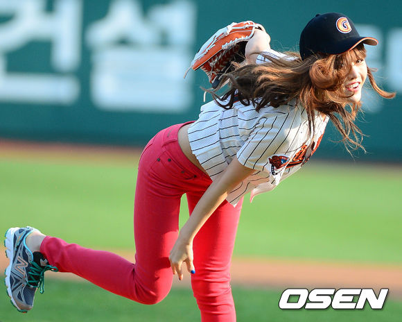 4일 오후 부산 사직구장에서 열린 롯데 자이언츠와 삼성 라이온스의 경기, 경기에 앞서 방송인 박은지가 시구를 하고 있다.