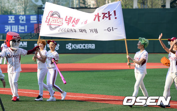 4일 오후 서울 목동야구장에서 열린 2013 한국야쿠르트 세븐프로야구 넥센 히어로즈와 KIA 타이거즈의 경기, 경기에 앞서 시구를 마친 걸그룹 GI가 넥센의 4강 기원이 적인 현수막을 들고 경기장을 나가고 있다.