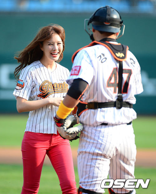 4일 오후 부산 사직구장에서 열린 롯데 자이언츠와 삼성 라이온스의 경기, 경기에 앞서 방송인 박은지가 시구를 마치고 롯데 강민호와 인사를 나누고 있다.