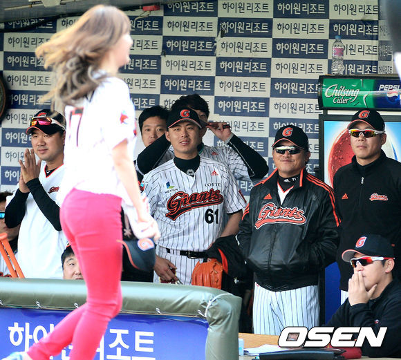4일 오후 부산 사직구장에서 열린 롯데 자이언츠와 삼성 라이온스의 경기, 경기에 앞서 방송인 박은지가 시구를 마치고 롯데 더그아웃의 코칭스태프, 선수들에게 인사를 하고 있다.