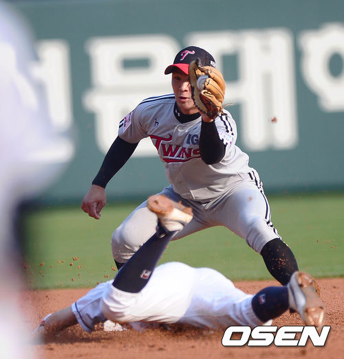 4일 오후 잠실구장에서 열린 '2013 한국야쿠르트 세븐 프로야구'LG 트윈스와 두산 베어스 경기,1회말 2사 홍성흔 타석때 1루 주자 정수빈 2루도루를 하였으나 LG 오지환 유격수에게 태그아웃 처리되고 있다.