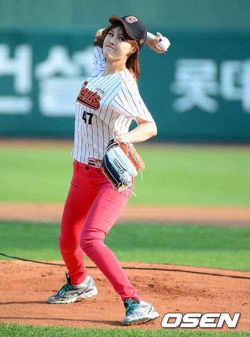 4일 오후 부산 사직구장에서 열린 롯데 자이언츠와 삼성 라이온스의 경기, 경기에 앞서 방송인 박은지가 시구를 하고 있다.