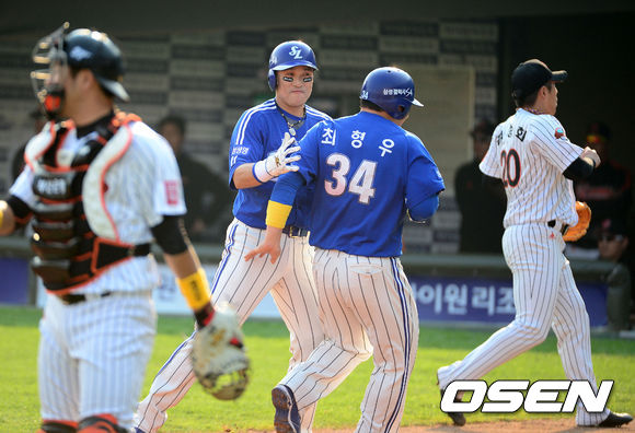 4일 오후 부산 사직구장에서 열린 롯데 자이언츠와 삼성 라이온스의 경기,1회초 1사 2,3루에서 삼성 박석민의 2타점 좌전 적시타에 이승엽과 최형우가 홈을 밟으며 기뻐하고 있다.