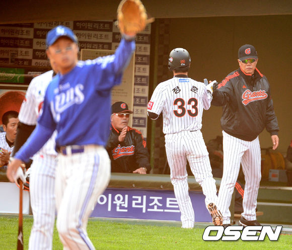 4일 오후 부산 사직구장에서 열린 롯데 자이언츠와 삼성 라이온스의 경기,3회말 1사 1루에서 대타로 나선 롯데 신본기의 1타점 적시 2루타에 정훈이 홈을 밟고 더그아웃에서 김시진 감독과 하이파이브를 하고 있다.