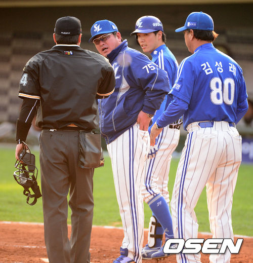 4일 오후 부산 사직구장에서 열린 롯데 자이언츠와 삼성 라이온스의 경기,3회초 무사에서 삼성 정형식이 기습번트를 시도하다 타구에 몸을 맞고 아웃되자 류중일 감독이 그라운드에 나와 우효동 구심과 이야기를 나누고 있다.