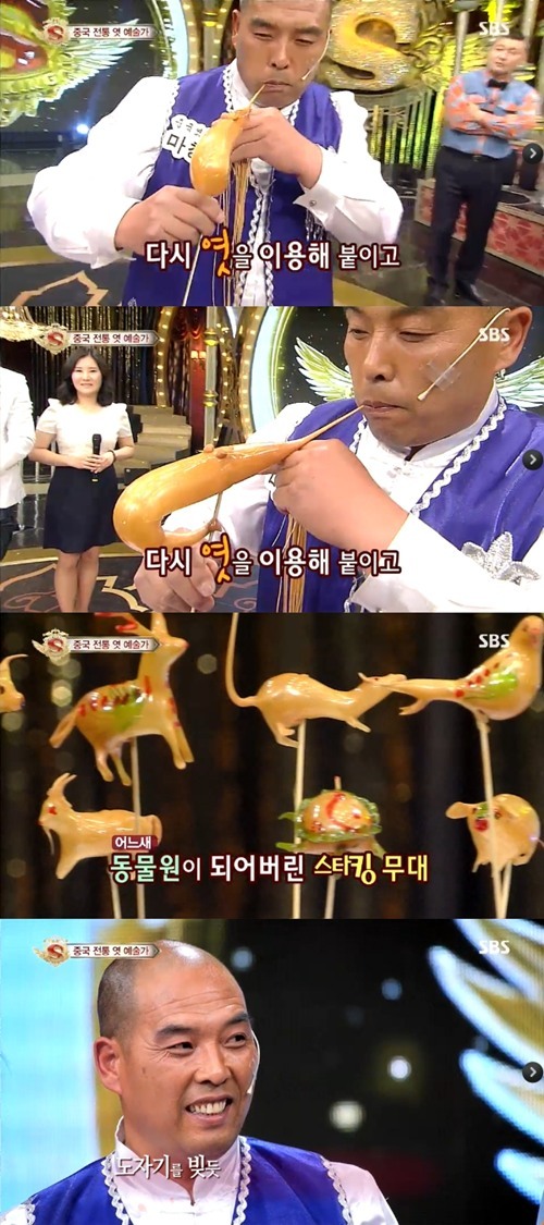 마칭왕은 4일 방송된 SBS '놀라운 대회 스타킹'(이하 스타킹)에 출연해 스튜디오에서 직접 약 3분 만에 엿으로 새우를 만들어냈다.
