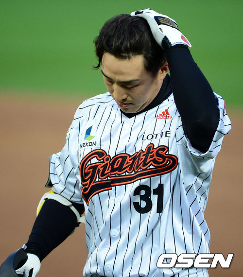 4일 오후 부산 사직구장에서 열린 롯데 자이언츠와 삼성 라이온스의 경기,6회말 무사 2루에서 롯데 손아섭이 내야땅볼로 물러나며 아쉬워하고 있다.