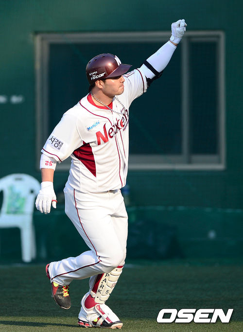 4일 오후 서울 목동야구장에서 열린 2013 한국야쿠르트 세븐프로야구 넥센 히어로즈와 KIA 타이거즈의 경기, 1회말 2사 2루에서 넥센 박병호가 좌월 솔로 홈런을 치고 관중석을 향해 인사를 하고 있다.