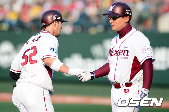 4일 오후 서울 목동야구장에서 열린 2013 한국야쿠르트 세븐프로야구 넥센 히어로즈와 KIA 타이거즈의 경기, 1회말 2사 2루에서 넥센 박병호가 좌월 솔로 홈런을 치고 심재학 코치와 하이파이브를 하고 있다.