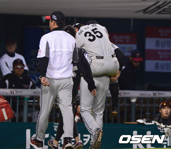 4일 오후 잠실구장에서 열린 '2013 한국야쿠르트 세븐 프로야구'LG 트윈스와 두산 베어스 경기,8회초 1사 만루 손주인 희생플라이때 3루주자 이진영 태그업을 하였으나 홈에서 태그아웃처리되며 부상을 입고 업혀나가고 있다.