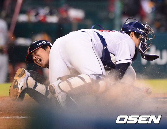 이진영은 4일 잠실구장에서 열린 ‘2013 한국야쿠르트 세븐 프로야구’ 두산과 경기서 8회초 홈을 향해 리터치하다 포수 블로킹의 막혀 태그아웃 당했고 이 과정에서 왼쪽 정강이에 찰과상을 당했다.