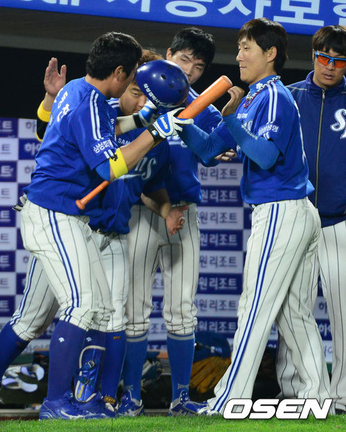 4일 오후 부산 사직구장에서 열린 롯데 자이언츠와 삼성 라이온스의 경기,8회초 2사에서 삼성 조동찬이 솔로포를 날리고 더그아웃에서 동료선수들의 축하를 받고 있다.