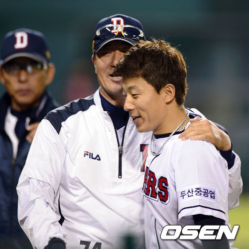 경기 종료후 정명원 투수코치가 마무리를 잘끝낸 오현택에게 축하를 해주고 있다./ ajyoung@osen.co.kr