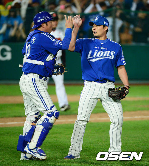 경기후 삼성 진갑용과 오승환이 승리 세리머니를 하고 있다. 오승환은 9회 무사에서 롯데 조성환에 2루타를 허용하며 위기를 맞았다. /jpnews@osen.co.kr