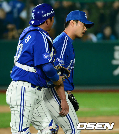 경기후 삼성 진갑용과 오승환이 이야기를 나누고 있다. 오승환은 9회말 무사에서 롯데 조성환에 2루타를 허용, 위기를 맞았다./jpnews@osen.co.kr