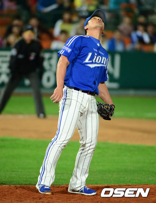 9회말 1사 2루에서 삼성 오승환이 롯데 신본기의 뜬공 타구를 바라보고 있다./jpnews@osen.co.kr