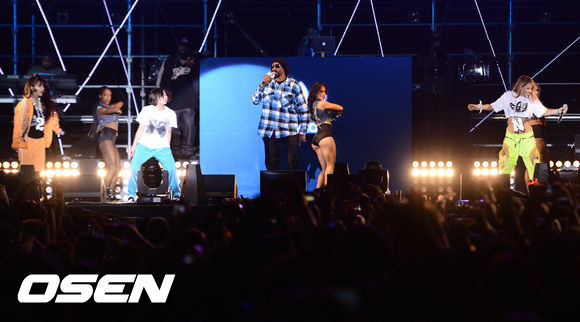 4일 오후 서울 방이동 올림픽공원 올팍 출구장에서 열린 미국 힙합가수 스눕독(Snoop Dogg) 첫 내한 공연 '유나이트 올 오리지날스 스눕독 라이브 인 서울(Unite all originals Snoop Dogg live in seoul)' 콘서트에서 투애니원과 스눕독 멋진무대를 선보이고 있다.
