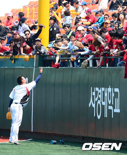 5일 오후 서울 목동야구장에서 열린 2013 한국야쿠르트 세븐프로야구 넥센 히어로즈와 KIA 타이거즈의 경기, 경기에 앞서 KIA 김진우가 아이들에게 야구공을 던져주고 있다.