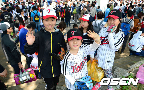 5일 오후 서울 잠실야구장에서 열린 2013 한국야쿠르트 세븐프로야구 두산 베어스와 LG 트윈스의 경기, 경기에 앞서 입장을 기다리는 어린이 팬들이 취재진을 향해 포즈를 취하고 있다.