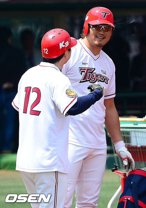 5일 오후 서울 목동야구장에서 열린 2013 한국야쿠르트 세븐프로야구 넥센 히어로즈와 KIA 타이거즈의 경기, 경기에 앞서 KIA 차일목과 최희섭이 즐겁게 얘기를 나누고 있다.