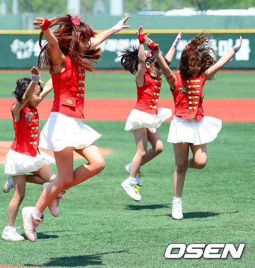 5일 오후 서울 목동야구장에서 열린 2013 한국야쿠르트 세븐프로야구 넥센 히어로즈와 KIA 타이거즈의 경기, 경기에 앞서 어린이 치어리더들과 그라운드 위에서 화려한 공연을 펼치고 있다.