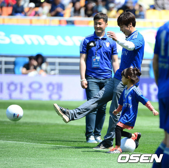 어린이날인 5일 오후 수원월드컵경기장에서 열린 현대오일뱅크 2013 K리그 클래식 수원 삼성 블루윙즈와 인천 유나이티드 FC의 경기, 경기에 앞서 송종국이 딸 지아양과 함께 시축을 하고 있다.