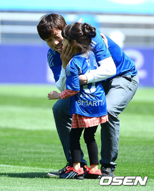 어린이날인 5일 오후 수원월드컵경기장에서 열린 현대오일뱅크 2013 K리그 클래식 수원 삼성 블루윙즈와 인천 유나이티드 FC의 경기, 경기에 앞서 송종국이 딸 지아양과 함께 시축을 마치고 딸의 얼굴을 어루만지고 있다.