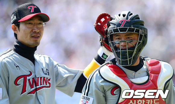 5일 오후 서울 잠실야구장에서 열린 2013 한국야쿠르트 세븐프로야구 두산 베어스와 LG 트윈스의 경기, 1회말 2사 1,3루에서 두산 오재원을 파울 플라이로 처리한 LG 포수 최경철이 정성훈과 덕아웃으로 가고 있다.
