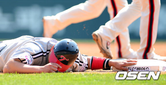5일 오후 서울 잠실야구장에서 열린 2013 한국야쿠르트 세븐프로야구 두산 베어스와 LG 트윈스의 경기, 3회초 2사 1루에서 LG 김용의 타석 때 두산 노경은의 폭투로 1루주자 최경철이 3루까지 쇄도했으나 태그아웃 처리되고 아쉬워하고 있다.