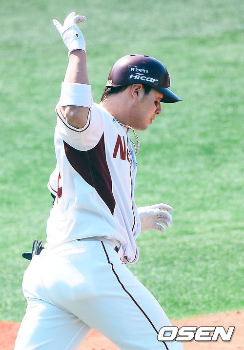 5일 오후 서울 목동야구장에서 열린 2013 한국야쿠르트 세븐프로야구 넥센 히어로즈와 KIA 타이거즈의 경기, 3회말 1,3루 넥센 박병호가 좌월 역전 스리런 홈런을 날린 후 기뻐하고 있다.