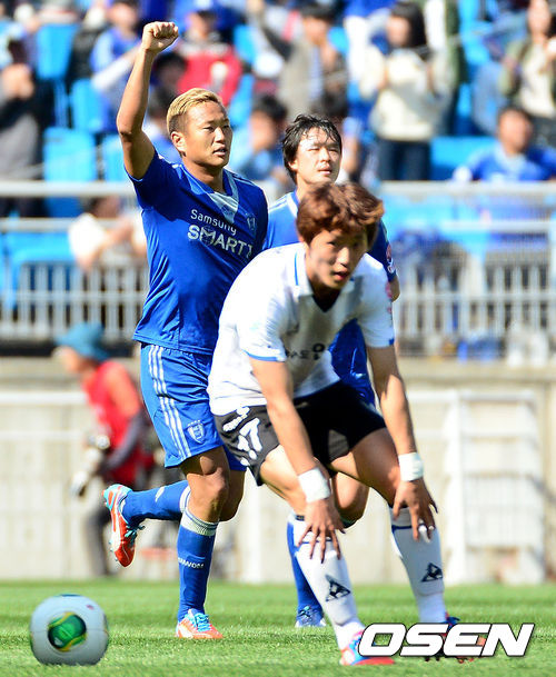 어린이날인 5일 오후 수원월드컵경기장에서 열린 현대오일뱅크 2013 K리그 클래식 수원 삼성 블루윙즈와 인천 유나이티드 FC의 경기, 후반 수원 정대세가 선제골을 넣고 기뻐하고 있다.