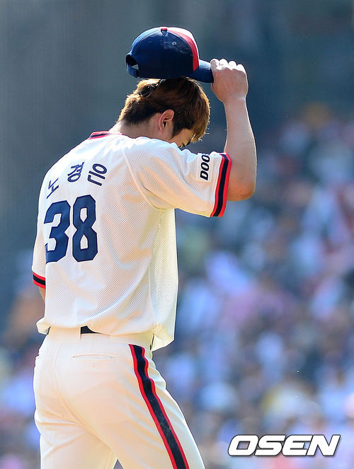 5일 오후 서울 잠실야구장에서 열린 2013 한국야쿠르트 세븐프로야구 두산 베어스와 LG 트윈스의 경기, 6회초 1사 만루에서 두산 노경은이 마운드를 내려가고 있다. 노경은은 5⅓이닝 1실점을 기록했다.