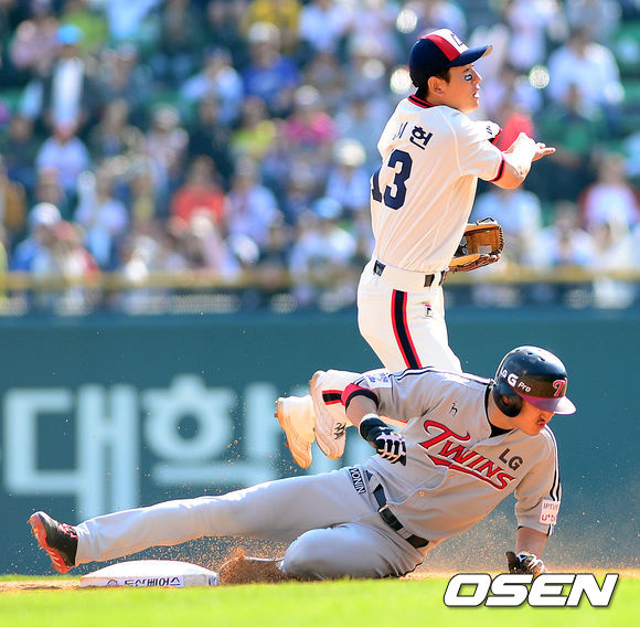 5일 오후 서울 잠실야구장에서 열린 2013 한국야쿠르트 세븐프로야구 두산 베어스와 LG 트윈스의 경기, 6회초 1사 만루에서 LG 정의윤의 내야 땅볼 때 두산 손시헌이 1루주자 박용택을 포스 아웃 처리하고 있다.