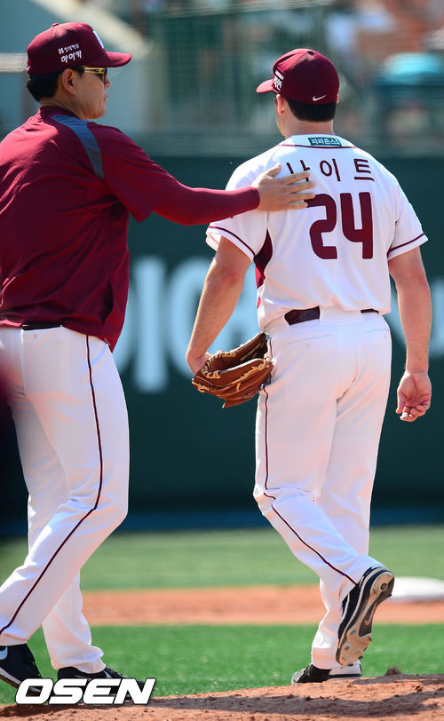 5일 오후 서울 목동야구장에서 열린 2013 한국야쿠르트 세븐프로야구 넥센 히어로즈와 KIA 타이거즈의 경기, 4회초 1사 주자 1,3루 KIA 김상현 타석에서 넥센 선발 나이트가 강판당하고 있다. 나이트는 선발 등판해 3⅓이닝 7피안타 1탈삼진 7사사구 8실점을 기록했다.