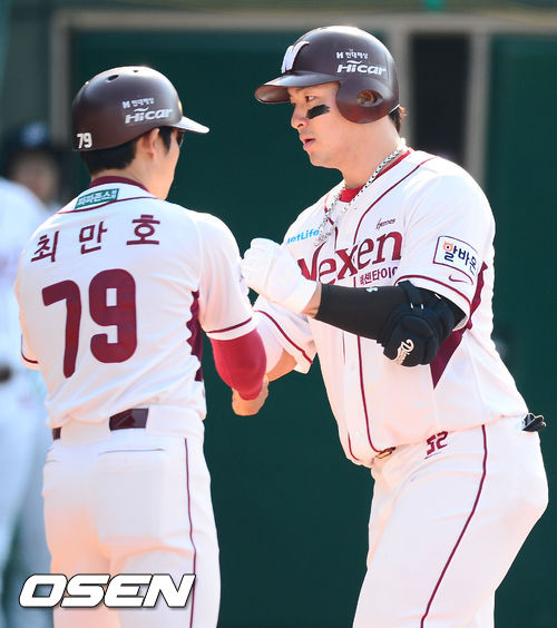5일 오후 서울 목동야구장에서 열린 2013 한국야쿠르트 세븐프로야구 넥센 히어로즈와 KIA 타이거즈의 경기,5회말 1사 주자 1,3루 넥센 박병호가 우중월 연타석 스리런 홈런을 날린 후 홈에서 최만호 코치와 하이파이브를 하고 있다.