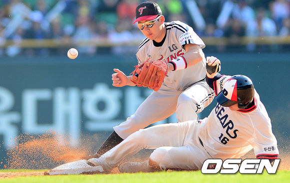 5일 오후 서울 잠실야구장에서 열린 2013 한국야쿠르트 세븐프로야구 두산 베어스와 LG 트윈스의 경기, 7회말 2사 1루에서 두산 임재철 타석 때 1루주자 이원석이 도루에 성공하고 있다.